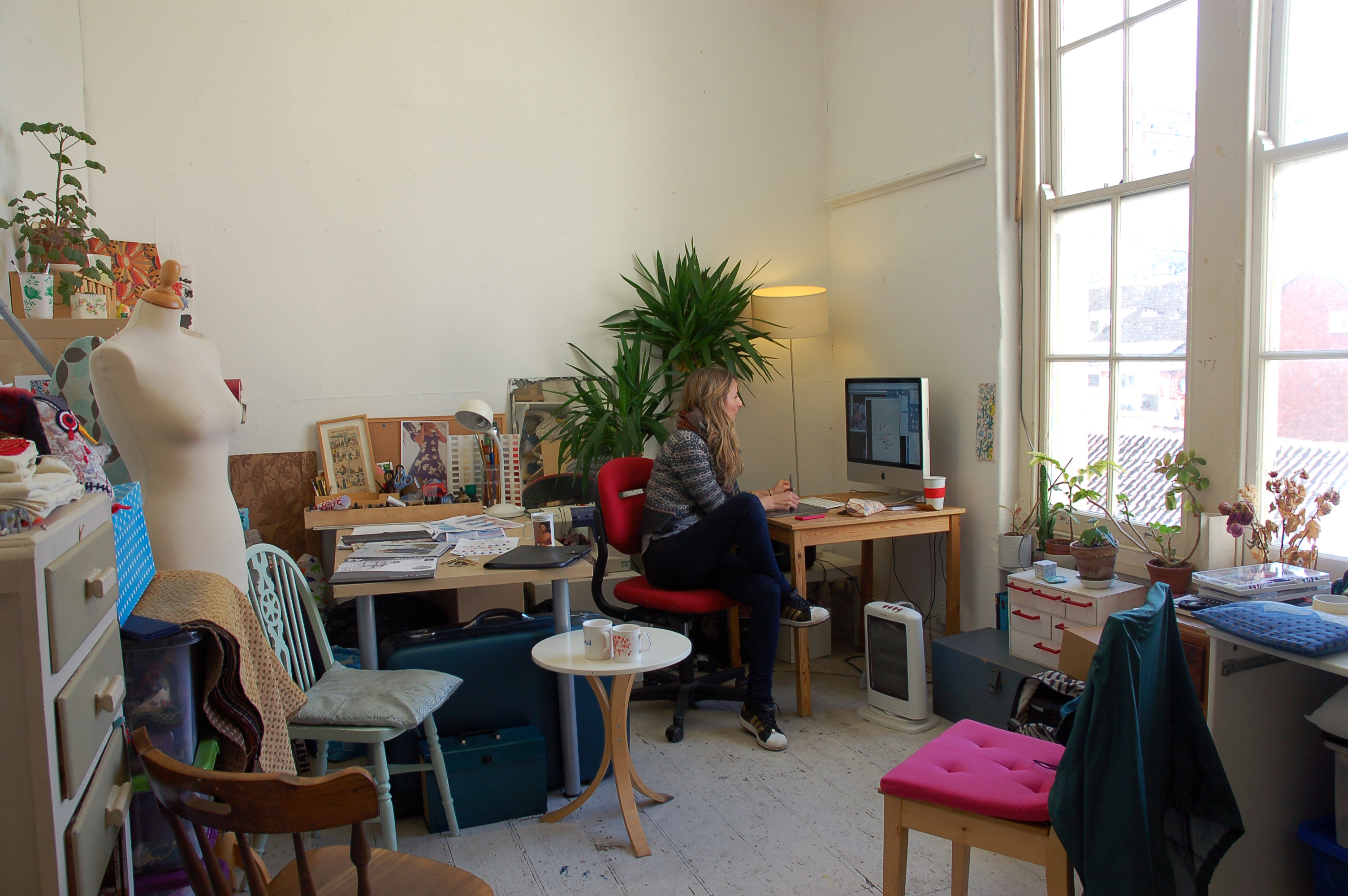 You can’t help but be aware of what everyone else is doing and want to have a look- it’s so diverse. So many different mediums are being used in here – it’s really inspiring. We have our doors open a lot of the time so we can peek in. For me, being a commercial designer, it reminds me that it’s really good to keep hand drawing. I think if I was just in an office with a whole load of people flat out on the computer my design work might become too digital looking, so for me I think it does rub off.